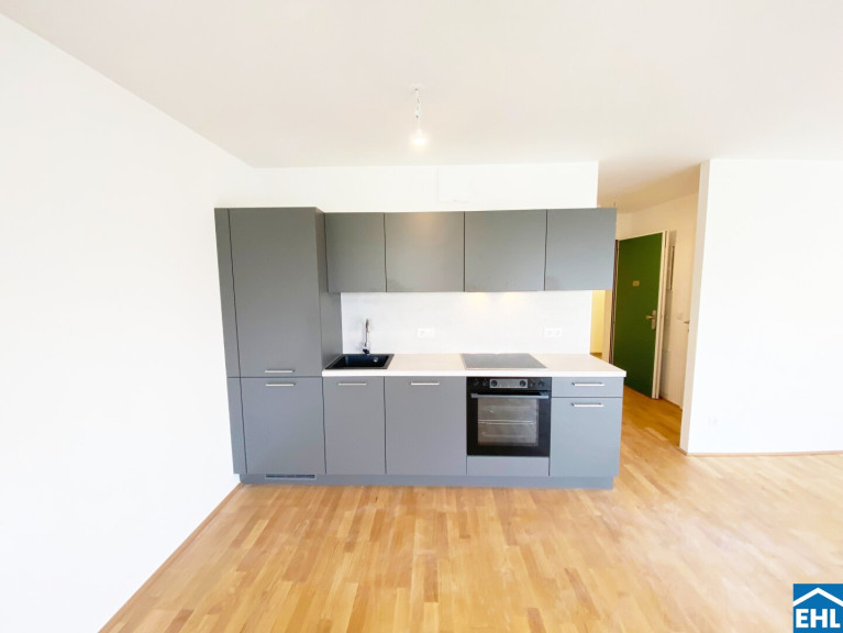 Die Wohnung selbst befindet sich in der 4. Etage und gliedert sich in eine geräumige Wohnküche mit vollausgestatteter Einbauküche und Schlafbereich, ein Badezimmer mit Dusche, Waschmaschinenanschluss und WC, einen Abstellraum sowie einen Vorraum. Der Südwestseitige Balkon rundet das Wohnerlebnis perfekt ab.