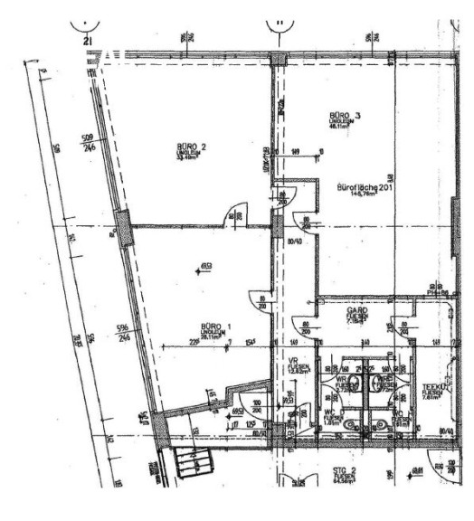Die Gesamtfläche beträgt ca. 146 m² und umfasst drei Büroräume, eine Teeküche sowie Sanitäranlagen.