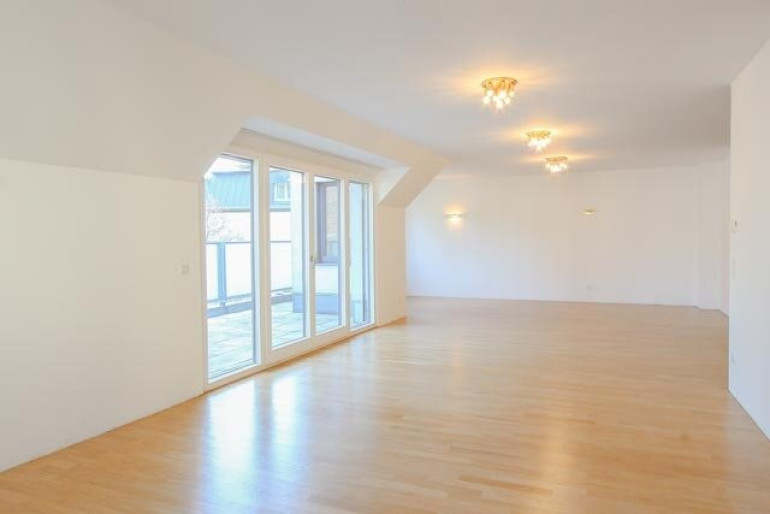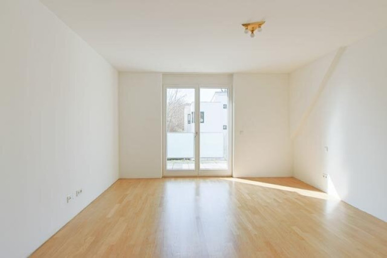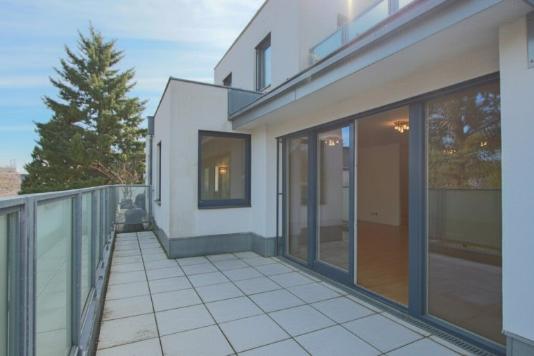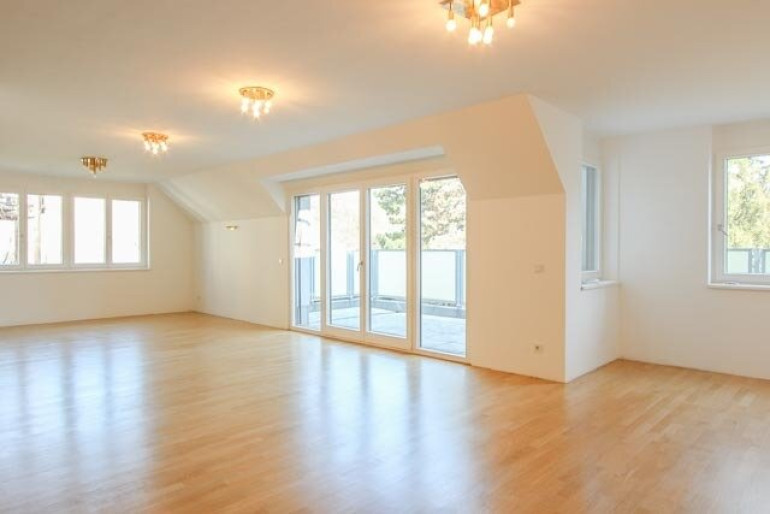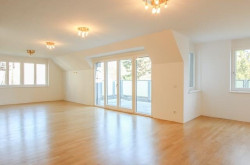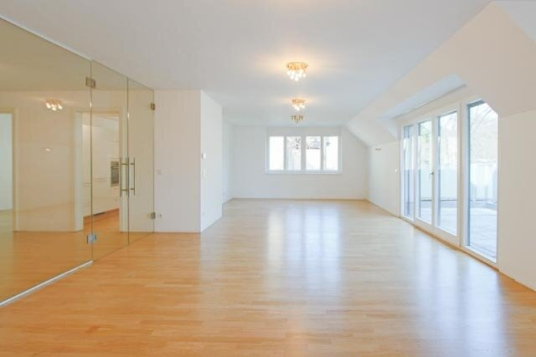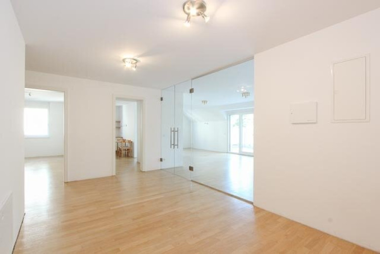 Vom großzügigen Vorraum gelangt man in den lichtdurchfluteten Wohnsalon mit direktem Zugang zur etwa18 m² großen Terrasse mit schönem Blick ins Grüne. Angrenzend befindet sich die separate Küche.