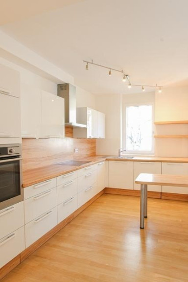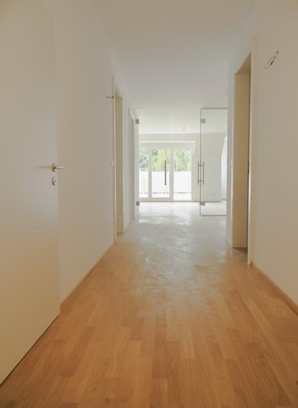 Der Parkettboden wurde vor Kurzem geschliffen. Die Sockelleisten sind noch nicht montiert und daher auf den Fotos nicht zu sehen. Sie werden jedoch vor dem Einzug noch angebracht bzw. sind bereits angebracht.