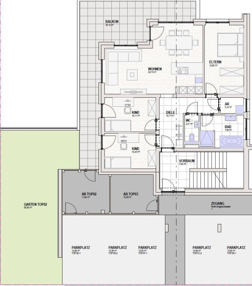 Parkett, Fliesen, Fußbodenheizung, Zentralheizung, Südbalkon, Bad mit Fenster, Badewanne, Dusche, Carport