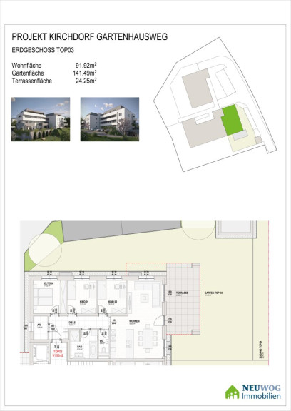 Die Immobilie befindet sich am Gartenhausweg in 4560 Kirchdorf an der Krems, einer Stadt in Oberösterreich. Sie liegt in einer ruhigen Gegend, in bester Zentrumslage in einer Sackgasse. Die 18 Wohneinheiten werden, im für die Fa. Neuwog üblichen, gehobenen Standard errichtet. NEUWOG steht für herzliche Betreuung und zufriedene Kunden!Beschreibung der Immobilie
