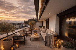 Das eigentliche Herzstück ist die 22,7 m² große Südterrasse. Feinsteinzeugbelag, dezente Ambientebeleuchtung, eine elektrische Markise mit Licht- und Windsensor. Hier frühstückt man mit Bergblick. Hier sitzt man abends, wenn die Sonne noch warm ist. Diese Terrasse ist kein Balkon – sie ist ein zweites Wohnzimmer.