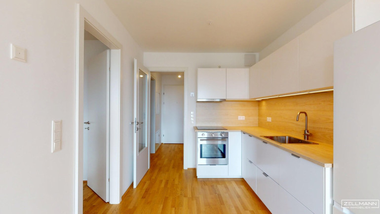 In attraktiver Lage des 14. Wiener Gemeindebezirks gelangt diese moderne 2-Zimmer-Neubauwohnung im Erstbezug zur Vermietung. Die Wohnung überzeugt durch eine durchdachte Raumaufteilung, viel Tageslicht sowie eine private Loggia mit südseitiger Ausrichtung. Der großzügige Wohn- und Essbereich bildet das Herzstück der Wohnung und öffnet sich zur gemütlichen Loggia, die einen angenehmen Freiraum für entspannte Stunden im Freien bietet. Durch die südseitige Orientierung ist der Wohnbereich besonders hell und freundlich gestaltet. Das Schlafzimmer präsentiert sich ebenfalls lichtdurchflutet und bietet ausreichend Platz für eine komfortable Schlaflösung. Ergänzt wird das Raumangebot durch ein Badezimmer mit Badewanne, einen praktischen Abstellraum sowie einen Vorraum. Die neue Einbauküche ist im Mietpreis natürlich enthalten.