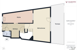 Erdgeschoß: Vorraum, WC, Küche, Wohnzimmer mit Ausgang in den Garten mit überdachter Terrasse;