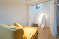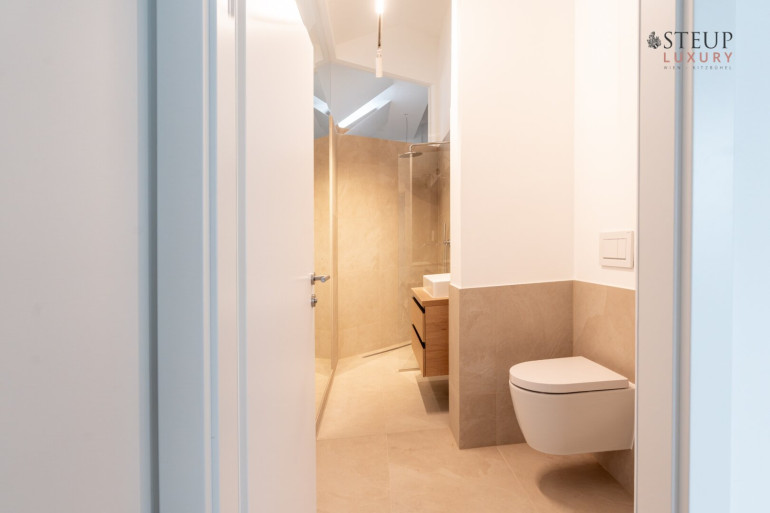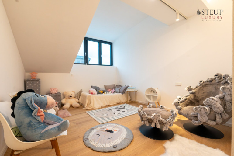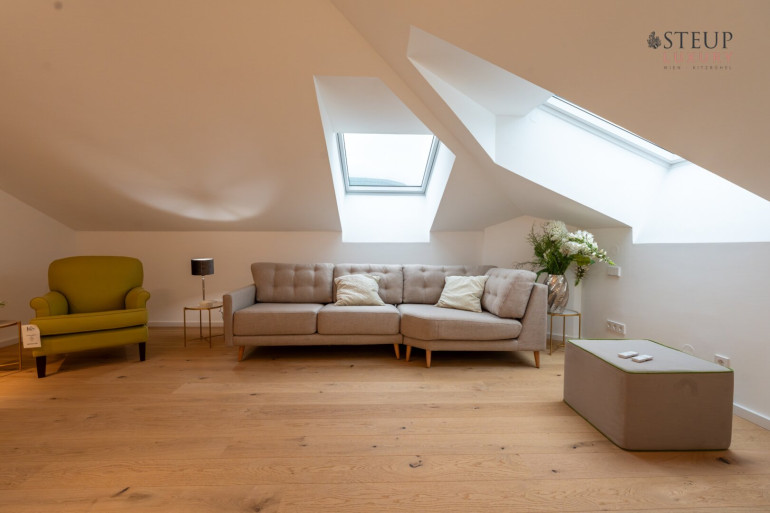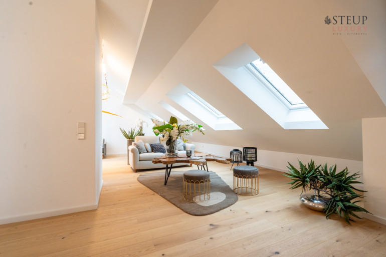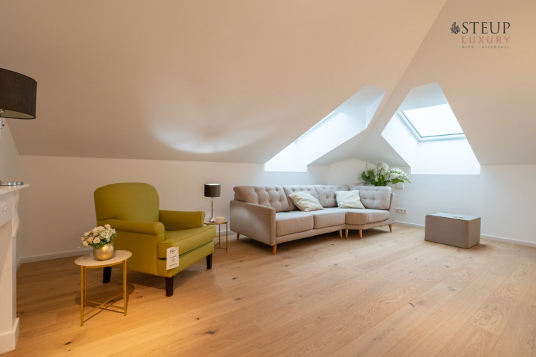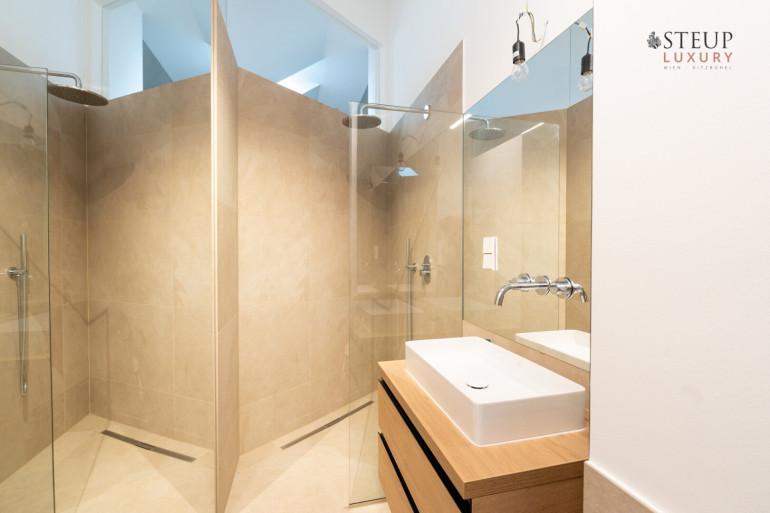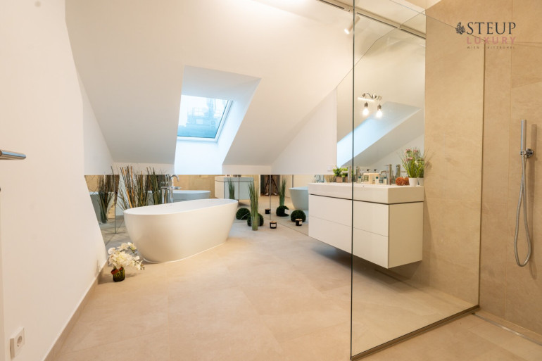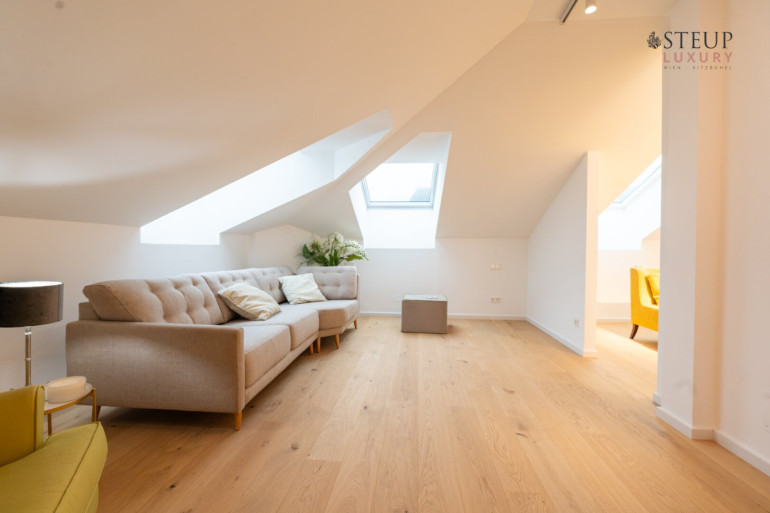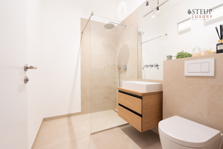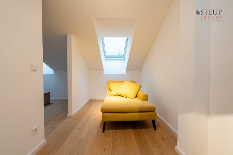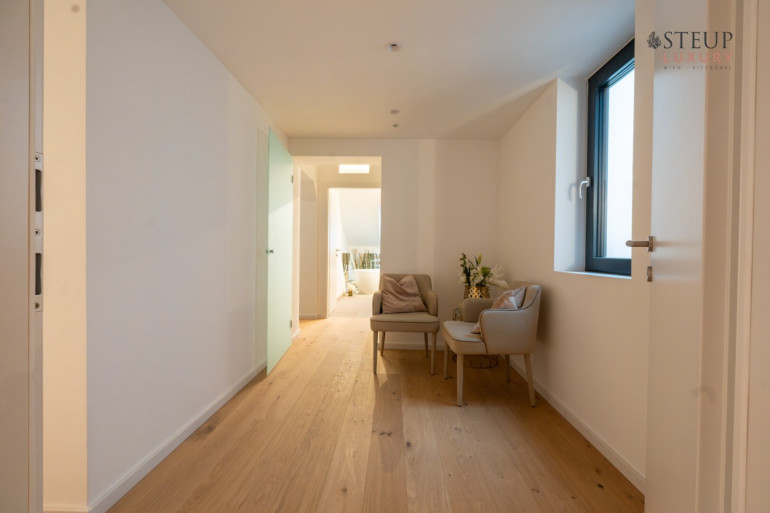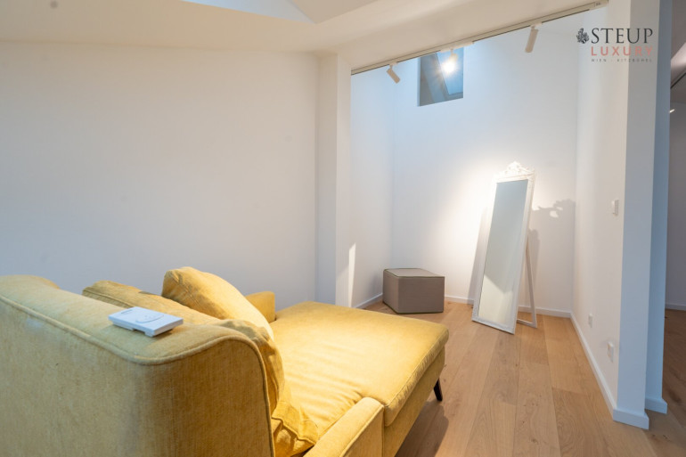 Über eine Treppe gelangt man in das obere Stockwerk, wo sich der private Spa-Bereich befinden kann – perfekt für den Einbau einer Sauna, Fitnessgeräte oder Wellness-Lounge. Der Wirtschaftsraum befindet sich anschließend. Von hier aus gibt es zudem die Möglichkeit, auf die Dachterrasse zu gelangen und einen einzigartigen Weitblick über Wien zu genießen.