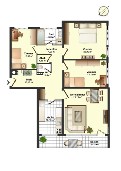 - Viel Platz: Durchdachter Grundriss mit 3 Schlafzimmern, großem Wohnzimmer und sonnigem Balkon.