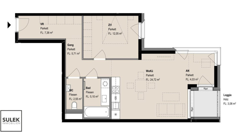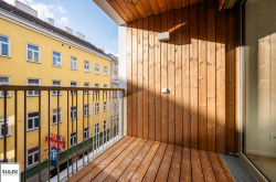 Über den langen Vorraum, mit ausreichend Platz für Schränke, und den weiterführenden Gang sind alle Räumlichkeiten erreichbar: das separate WC mit Handwaschbecken, das Badezimmer mit Badewanne und Waschmaschinen-Anschluss, das rd. 12m2 große Schlafzimmer, sowie die großzügige Wohnküche (rd. 29m2) mit vollausgestatteter Küche. Am anderen Ende des Wohnzimmers, beim Ausgang zur südseitig ausgerichteten Loggia, lässt sich ideal eine tagesbelichtete Arbeitsnische, einrichten. Diese Eckwohnung ist zur Apollogasse hin ausgerichtet.