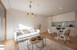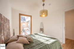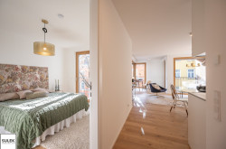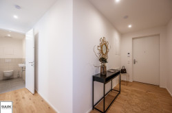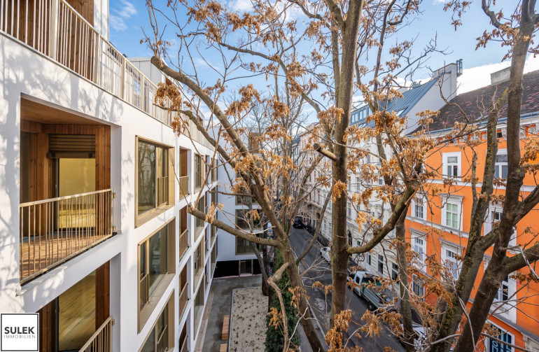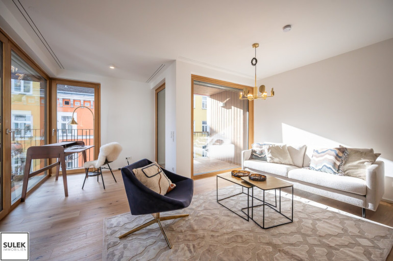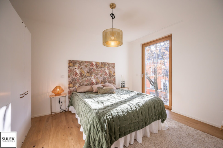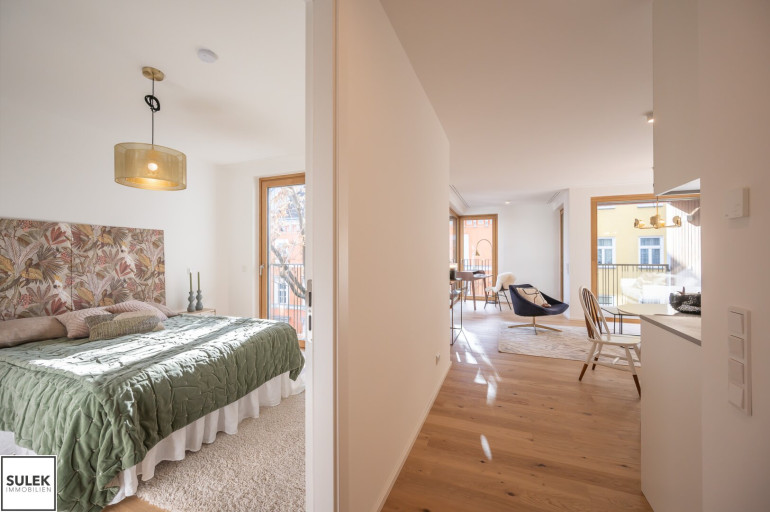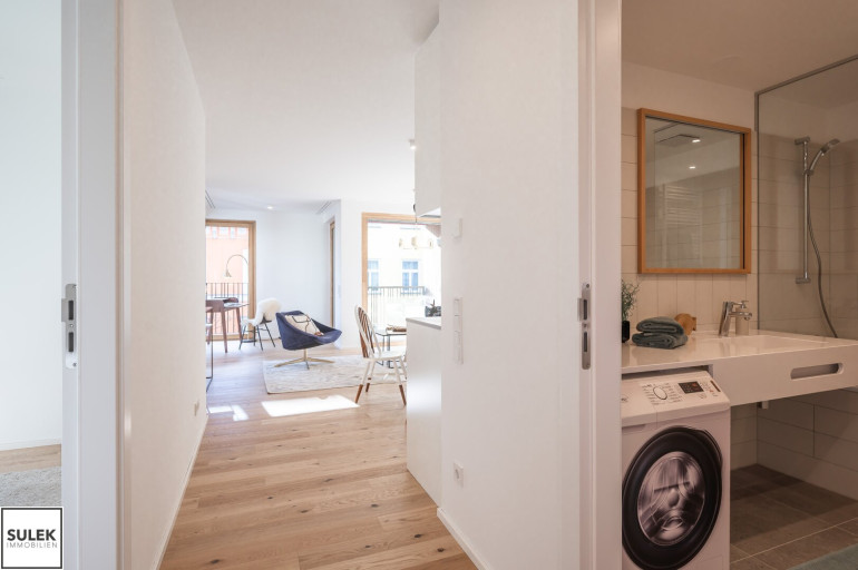 Gleich beim Betreten fällt der edle Parkettboden aus Eichenholz auf, unter dem sich eine moderne Fußbodenheizung verbirgt. In den Nassräumen wurden robuste Feinsteinzeugfliesen verlegt. Die Fenster aller Wohnungen weisen einen außenliegenden Sonnenschutz auf (fassadenintegrierte Raffstore mit 3-Bogenlamellen), der für effektive Beschattung und so auch im Sommer für angenehme Temperaturen sorgt. Im Dachgeschoss sind die Wohnräume zusätzlich mit Klimageräten ausgestattet.