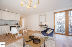 Die Küche nimmt einen besonders hohen Stellenwert in jeder dieser Wohnungen im 7. Bezirk in Wien ein, sie ist das kommunikative Zentrum. Deshalb wurde hier auf eine bewährte, zeitlose Optik in Weiß und zuverlässige Markenqualität von Miele gesetzt. Neben einer großen, integrierten Kühl-Gefrierschrankkombination zählen unter anderem auch ein Backofen, Cerankochfeld, Dunstabzug und Geschirrspüler zur Grundausstattung. Die Küchenzeilen sind raumhoch mit weißer Arbeitsfläche und Rückenwand und grifflos gestaltet.