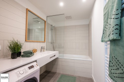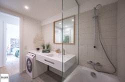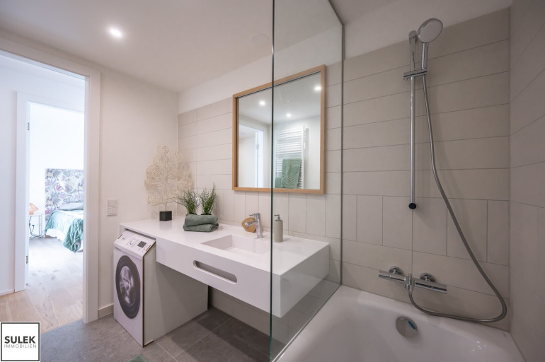Alle Wohneinheiten verfügen zeitgemäß über ein separates WC mit Handwaschbecken, sowie ein Badezimmer mit Badewanne und Handtuchheizkörper. Die Sanitärräume sind praktischerweise bereits mit einem Wandspiegel ausgestattet. Jede Wohneinheit verfügt über einen Waschmaschinen-Anschluss – situiert im Abstellraum oder Badezimmer der Wohnung. Auf den Freiflächen sind idealerweise bereits Pflanzentröge und Wasseranschlüsse installiert.