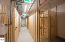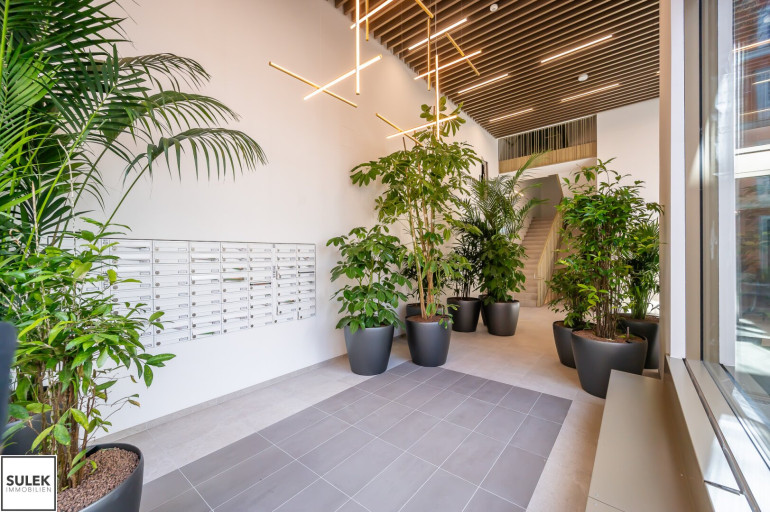 Der Hausgemeinschaft steht, neben den Räumlichkeiten für Fahrräder, Kinderwägen und Müllentsorgung, auch eine praktische, integrierte Paketkastenanlage, eine Waschküche und Tiefgarage mit zusätzlich anmietbaren PKW-Abstellplätzen zur Verfügung. Als zentraler Bereich der Wohnhausanlage lädt die Bewohner: innen des Hauses das Atrium im Innenhof, ausgestattet mit Sitzbänken und Spielhockern, in der ersten Etage des Hauses zum Entspannen und Verweilen ein. Ebenfalls im ersten Obergeschoss befindet sich der Gemeinschaftsraum, ausgestattet mit einer Küche, Esstisch, Sitzbänken und Loungegarnitur. Der Schattengarten im Erdgeschoss bietet den Mieter: innen einen zusätzlichen Rückzugsort im Freien. Im 4. Obergeschoss befindet sich auf dem Dach der Stiege 2 eine gemeinschaftliche Fitnessterrasse, ausgestattet mit Outdoor-Fitnessgeräten, welche zu sportlichen Aktivitäten anregen.