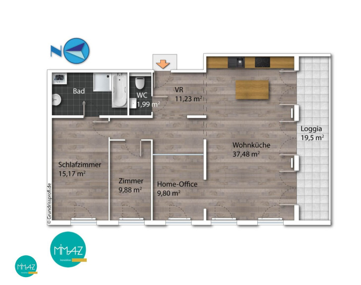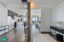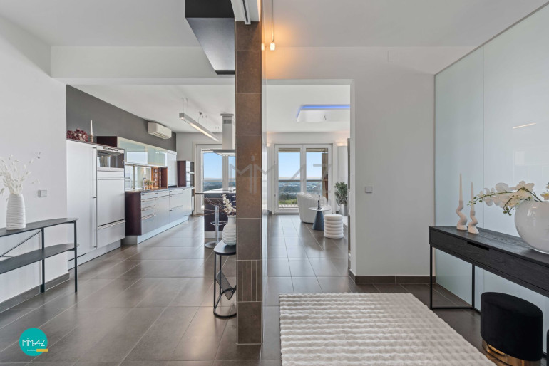 Großzügig und einzigartig präsentiert sich das Entrée der Wohnung mit dem einladenden, offenen Eingangsbereich mit Blick in die Wohnküche und die daran anschließende lichtdurchflutete Loggia.