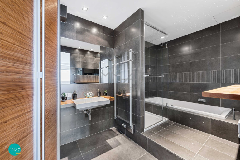 Das angrenzende Master-Schlafzimmer sorgt mit einem neu verlegten Teppichboden für ein besonderes Wohlfühl-Flair und ist mit einem Badezimmer en-suite ausgestattet. Dieses verfügt über eine Badewanne, eine Dusche, ein Handwaschbecken und einen mit einer Schiebetüre abgetrennten Abstellbereich mit Waschmaschinenanschluss. Genial geplant und mit kleinen außergewöhnlichen Details (z.B. Sternenhimmel) versehen, präsentiert sich das Badezimmer als eine wunderbare Wellness- und Ruheoase.