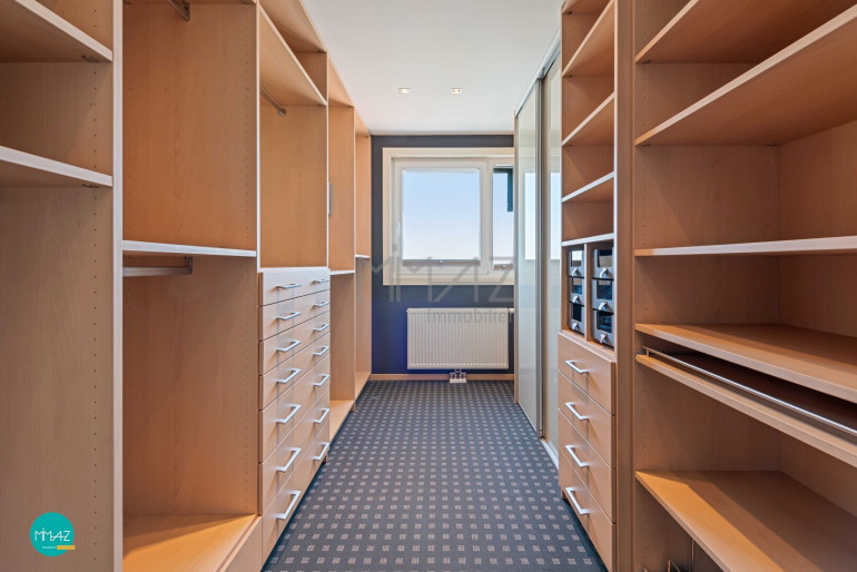 Über den offenen Vorraum mit separater Toilette (mit Handwaschbecken und Einbauschrank) sind die beiden Schlafzimmer zentral begehbar. Das mittlere Zimmer wurde bis jetzt als große begehbare Garderobe mit maßangefertigten Cabinet-Schränken genutzt.
