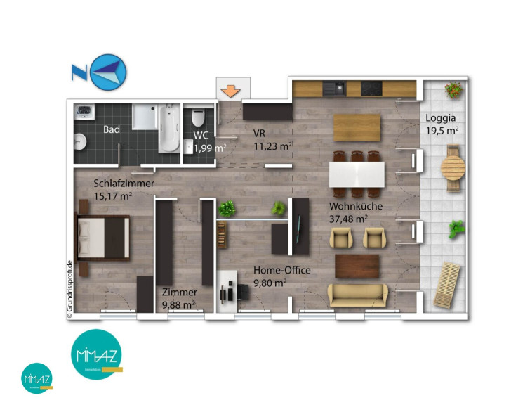 Das verlängerte Wohnzimmer, die knapp 20m² große, südseitig ausgerichtete Loggia (mit Strom- und Wasseranschluss), bietet ausreichend Platz für einen weiteren Ess- und Chillbereich sowie ein gemütliches Hideaway in luftiger Höhe.