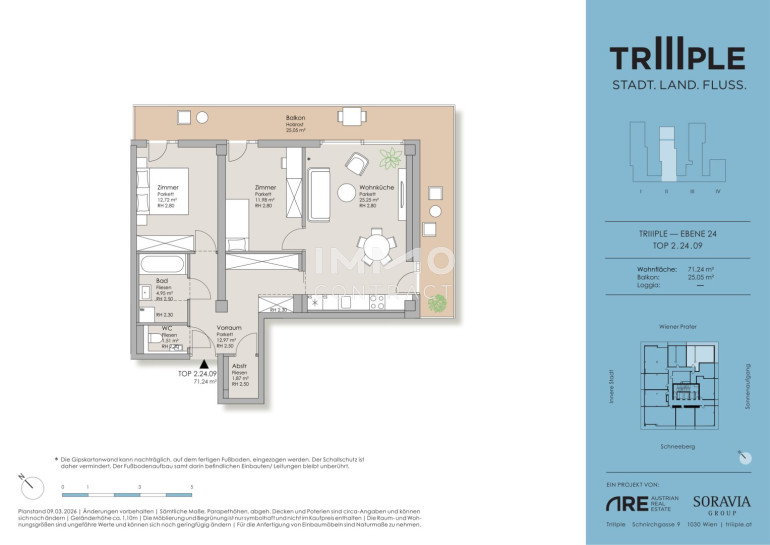 TrIIIple liegt ideal, um all Ihre Wunschdestinationen rasch und unkompliziert zu erreichen. Mit der fußläufig entfernten U3 (Schlachthausgasse, Erdberg) erreicht man in knapp zehn Minuten den Stephansplatz und mit der Straßenbahnlinie 18 (Schlachthausgasse) in 15 Minuten den Hauptbahnhof. Mit dem Auto geht es von der Tiefgarage aus in rund 15 Minuten zum Flughafen. Der Treppelweg am Donaukanal mit Radweg befindet sich direkt vor der Anlage, auch der grüne Prater ist für Sportbegeisterte zu Fuß erreichbar. Das Freizeitangebot wird durch vielfältige Gastronomie und Shops abgerundet.Beschreibung der Immobilie