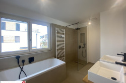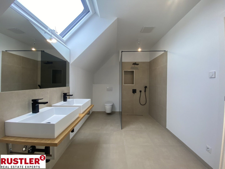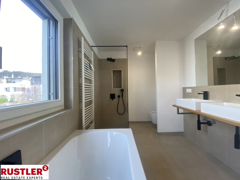 Die Liebe zum Detail zieht sich durch alle Bereiche und basiert auf ausgewählten Materialien und hochwertigen Markenprodukten. Elegante Parkettböden in allen Wohn- und Schlafräumen, Innentüren weiß matt mit Holzzarge bzw. Glastüren, großzügige Terrasse im Erdgeschoß mit Kaltwasseranschluss und Außenbeleuchtung, Terrasse im Dachgeschoß mit beeindruckender Aussicht, großformatige Fliesen (60 x 60 cm) in den Sanitärbereichen, Badewannen mit Markenarmaturen, bodenbündige Duschen, sämtliche Häuser werden vollständig mit Raffstores ausgestattet und noch vieles mehr...