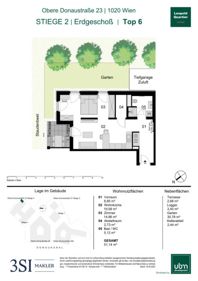 Diese moderne und ungestörte Gartenwohnung mit viel Licht ist etwas besonderes mitten in der Stadt. Die Einheit verfügt über eine Wohnnutzfläche von ca. 51 m² und bietet zusätzlich einen ca. 3 m² Loggia und 30,7 m² Garten ausgerichtet in den Osten.