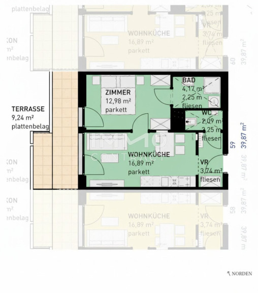 Alle Einheiten werden schlüsselfertig übergeben — Sanitärinstallationen, Fliesen und Parkett sind im Kaufpreis enthalten. Genauere Angaben zur Ausstattung entnehmen Sie bitte der Leistungsbeschreibung im Booklet.
