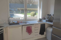 Die Küche ist wunderschön verbaut und mit allen nötigen Elektrogeräten eingerichtet, die Sie für modernes Kochen brauchen. Sie verfügt über einen großen amerikanischen Kühlschrank und über ein großes Fenster zur Terrasse und zum Pool hin. Daher ergibt sich die Möglichkeit, hier ihre Familie oder ihre Gäste direkt zu versorgen. Darüber hinaus gibt s auch noch eine sehr große Speisekammer.