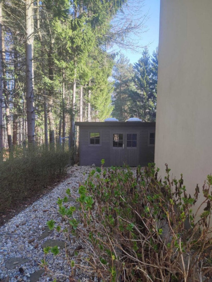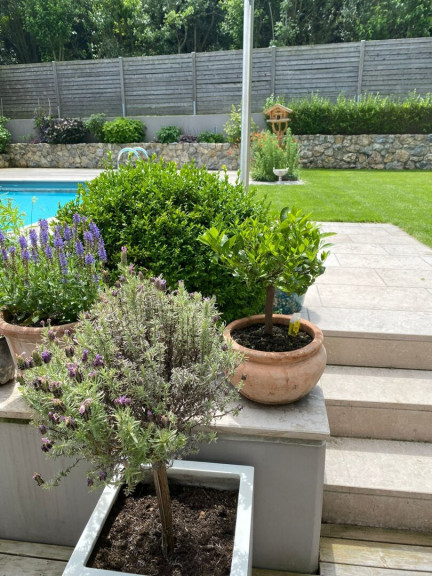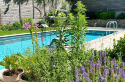 Der Garten ist nahezu uneinsichtig und wird durch den großen Pool dominiert, aber auch Blumen und Gemüse finden genügend Platz. Der Pool ist von einer großzügigen Terrasse eingerahmt und hat natürlich auch eine Außendusche.