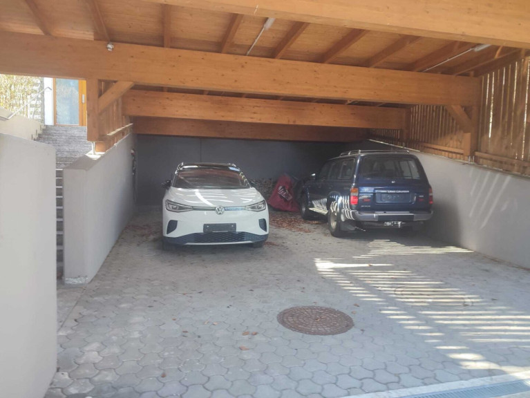 Der Carport für 2 Autos hat einen direkten Zugang zum Haus und ist mit einem Elektroanschluss ausgestattet.