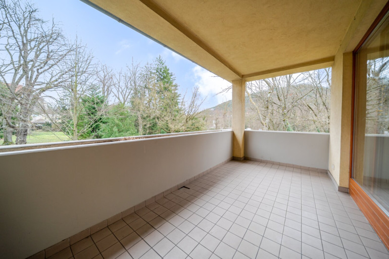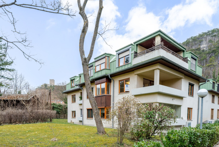 Die Loggia bietet einen ruhigen Rückzugsort mit Blick ins Grüne – perfekt für entspannte Stunden im Freien. Inklusive Ausblick auf die Burgruine Rauheneck.