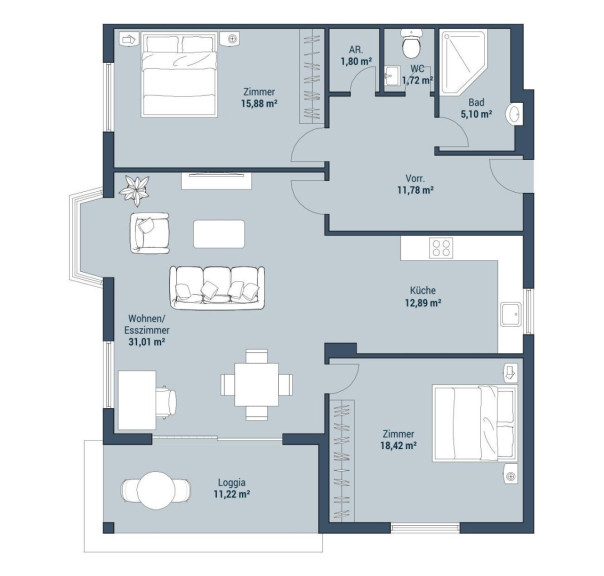 Auf rund 109 m² Wohnfläche inkl. einer 11 m² Loggia genießen Sie ein besonders großzügiges Raumgefühl – ideal für Paare mit Platzbedarf, Familien oder anspruchsvolle Eigennutzer.