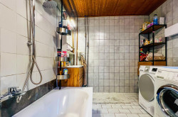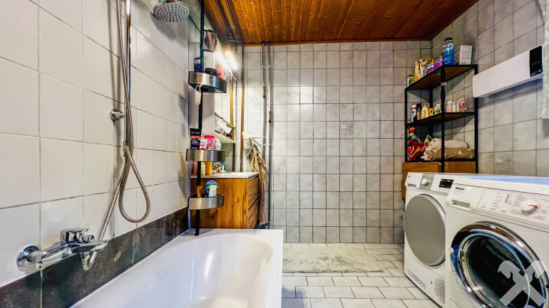 - Badezimmer mit Wanne sowie Platz für Waschmaschine und Trockner
