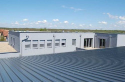 Konstruktion: Stahlkonstruktion mit Thermopaneel-Fassade und -Dach, Satteldach, Industrieboden aus Stahlbeton.