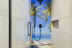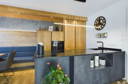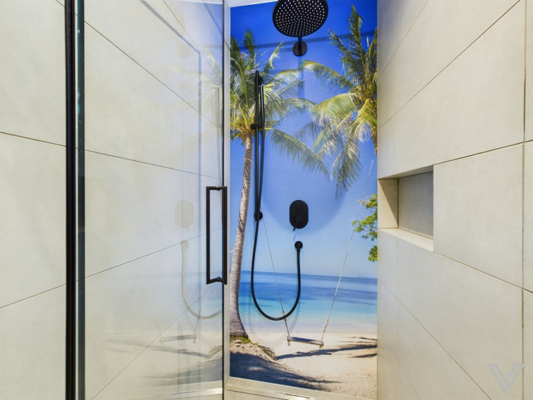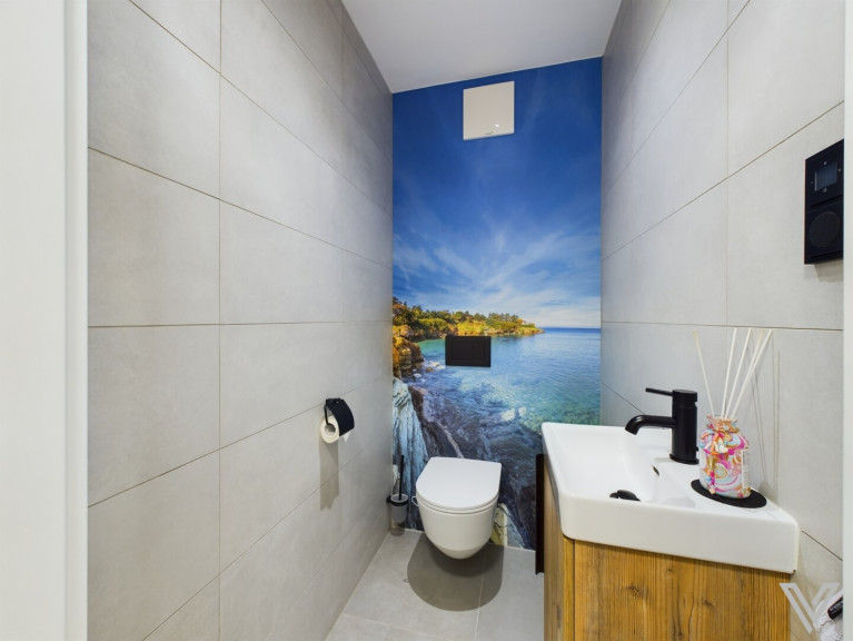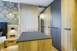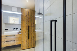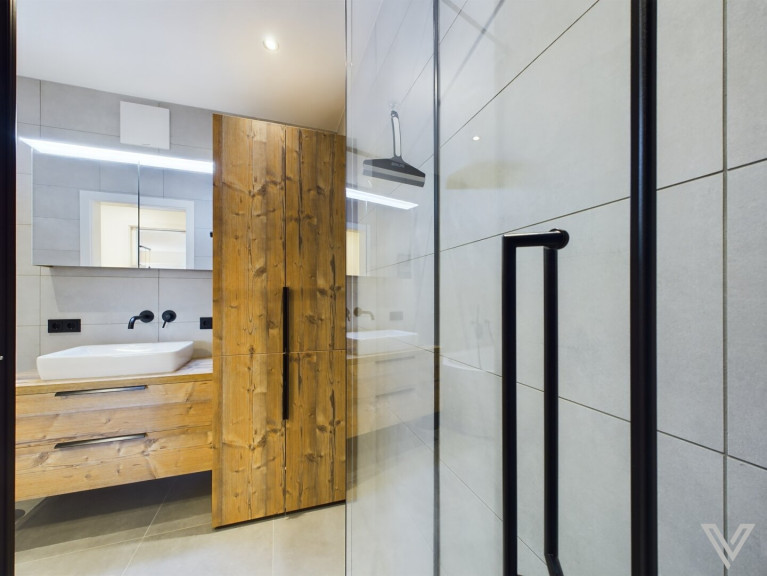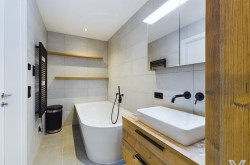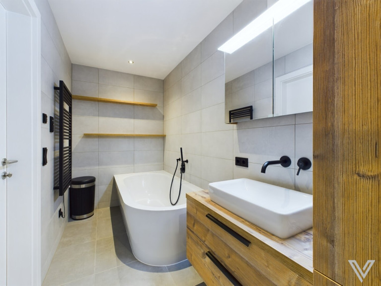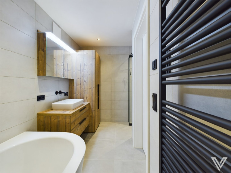 - das Bad verfügt über eine große Badewanne, eine Dusche, massgefertigte Möbel, eine Dusche und einen Handtuchtrockner