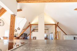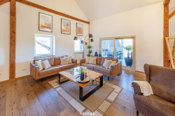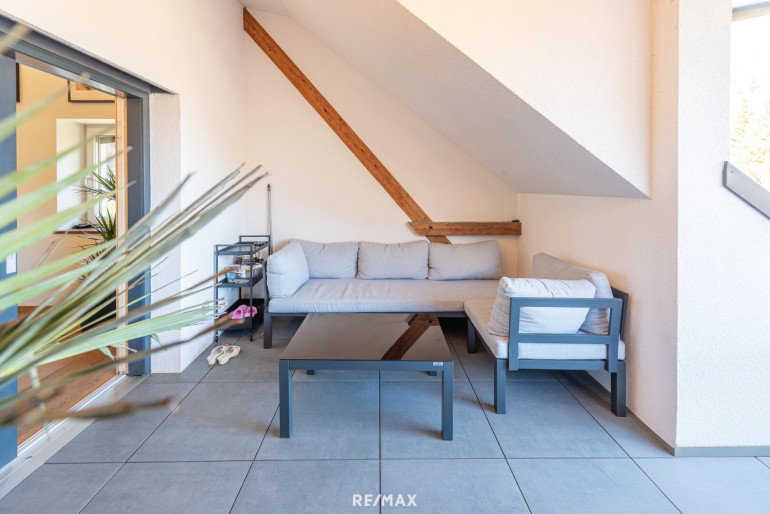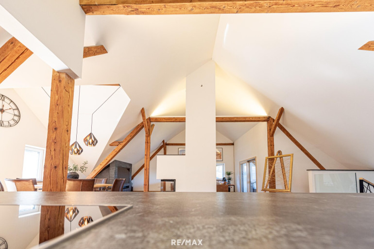 Das Dachgeschoss bildet das Herzstück des Hauses und beeindruckt durch ein offenes Wohnkonzept unter sichtbaren Holzbalken. Ein Kamin sorgt hier für behagliche Wärme, während die Terrasse mit Blick in die Natur zum Entspannen einlädt. Die hochwertige Ausstattung unterstreicht den exklusiven Charakter dieser Etage.