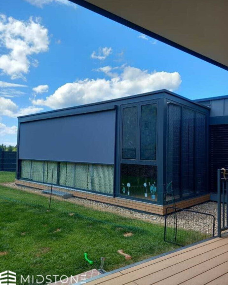 - Stehfalzfassade von Prefa sowie Rollläden und Insektengitter