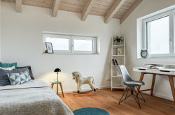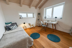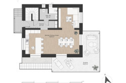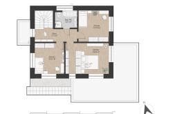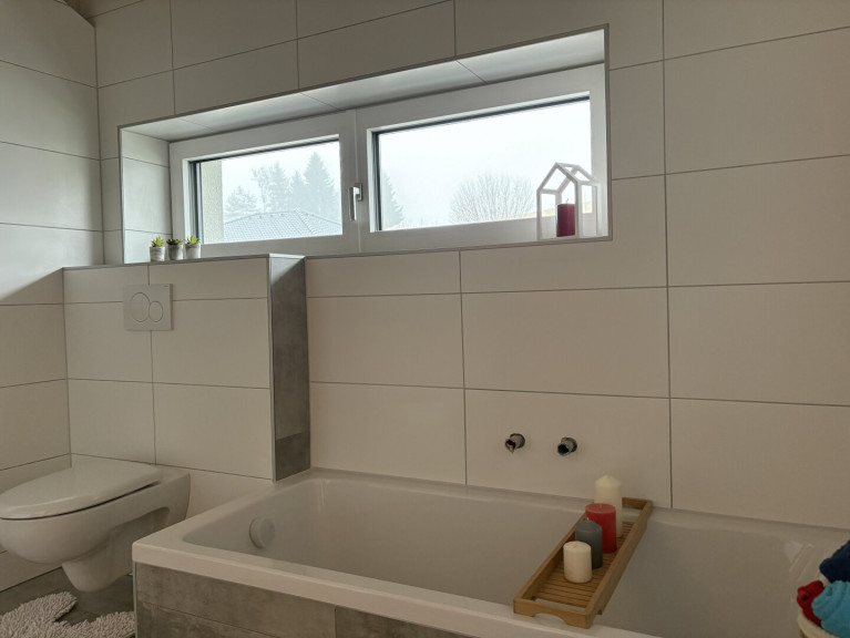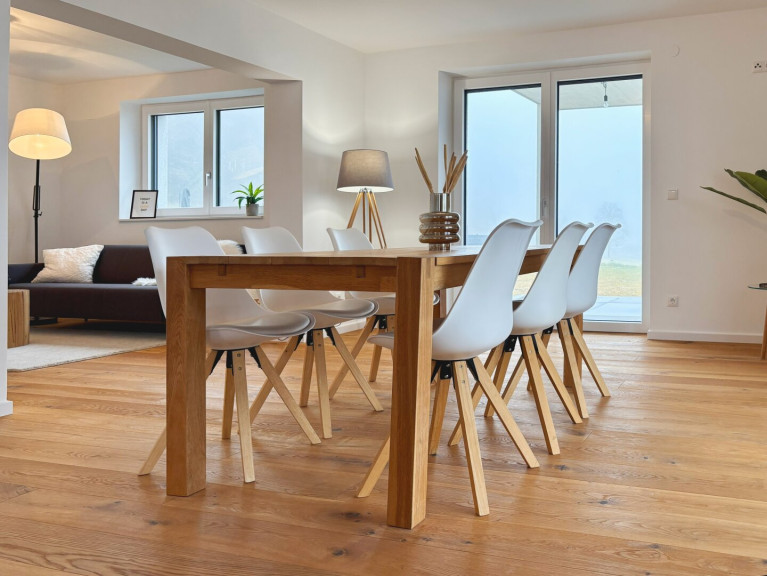 Im Erdgeschoss erwarten Sie ein lichtdurchfluteter Wohn-Essbereich mit weitläufigen Fensterfronten und direktem Zugang zur überdachten XXL-Terrasse & eine moderne offene Küche. Das Obergeschoss verfügt über ein großzügiges Hauptschlafzimmer, zwei weitere helle Schlafzimmer sowie ein komfortables Familienbad mit Badewanne, Dusche und WC. Für höchsten Wohnkomfort sorgen zahlreiche Ausstattungsdetails wie Fußbodenheizung mit Einzelraumregelung, Luftwärmepumpe, elektrische Rollläden und Glasfaseranschluss.