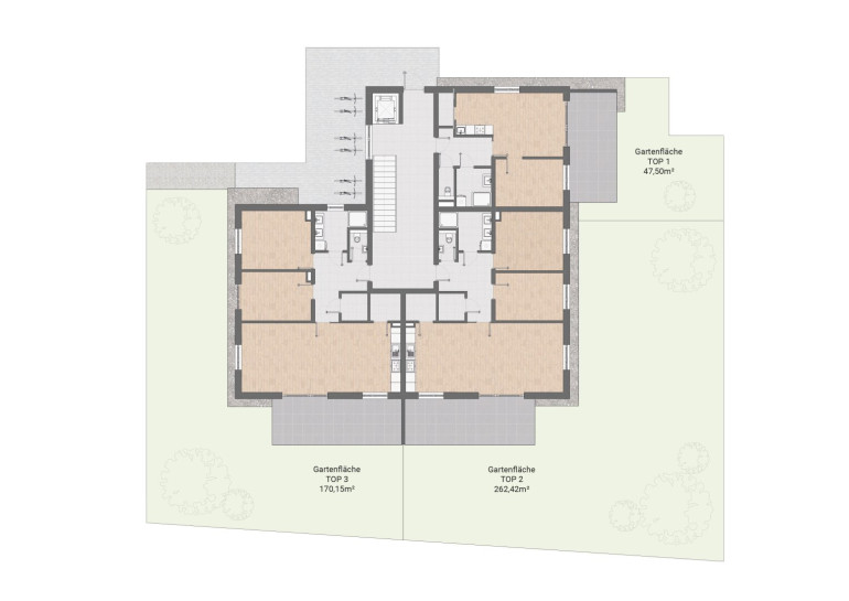 Drei großzügige Gartenwohnungen laden mit eigenen Terrassen und grünen Außenflächen zum Entspannen im Freien ein – ideal für Familien mit Kindern oder Gartenliebhaber.