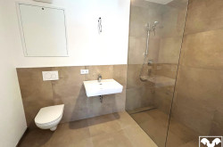 Die Wohnung verfügt über einen geräumigen und lichdurchfluteten Wohnbereich, der sich ideal für gemütliche Abende oder gesellige Anlässe eignet. Das Schlazimmer bietet einen ruhigen Rückzugsort mit ausreichend Platz für ein großes Bett und Stauraum. Das moderne Badezimmer ist mit einer Glaswand-Dusche, einem großem Waschbecken und einem Handtuchwärmer ausgestattet und rundet das durchdate Raumkonzept ab.