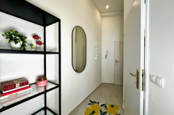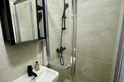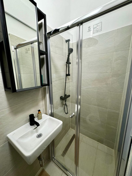 Das zeitgemäß ausgestattete Badezimmer verfügt über eine Dusche sowie ein WC. Ein einladender Vorraum bietet zusätzlichen Stauraum und rundet das durchdachte Raumkonzept ab.