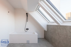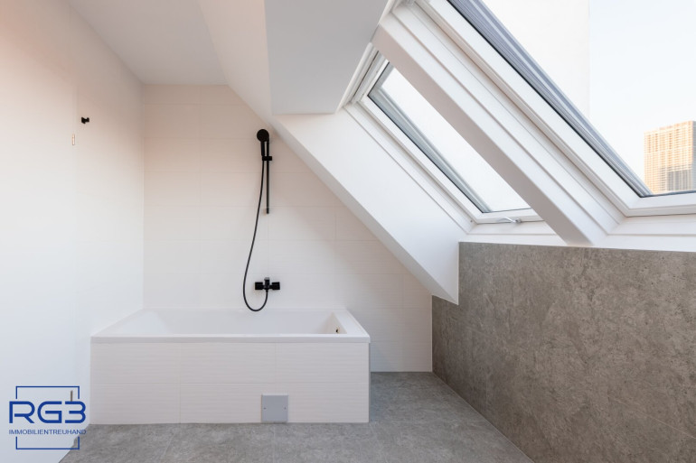 Mit dem Lift fahren Sie bequem in den ersten Stock. Sie betreten die Wohnung und spüren sofort: alles ist neu, alles ist ruhig, alles passt zusammen. Rechts befindet sich ausreichend Platz für Garderobe und Jacken. Links liegt das moderne Badezimmer mit extra Toilette, klar gestaltet, hochwertig ausgeführt.