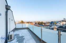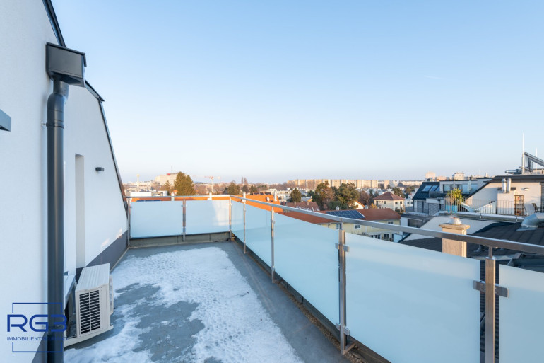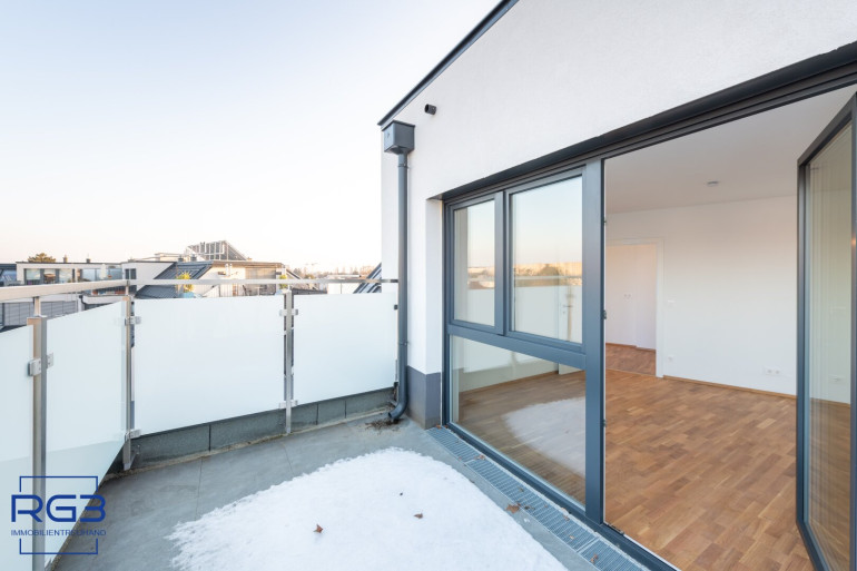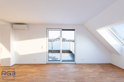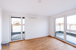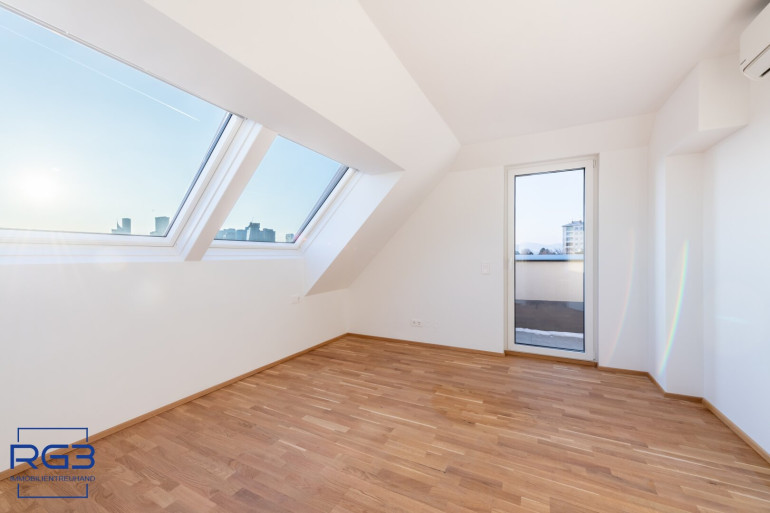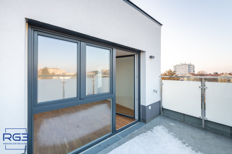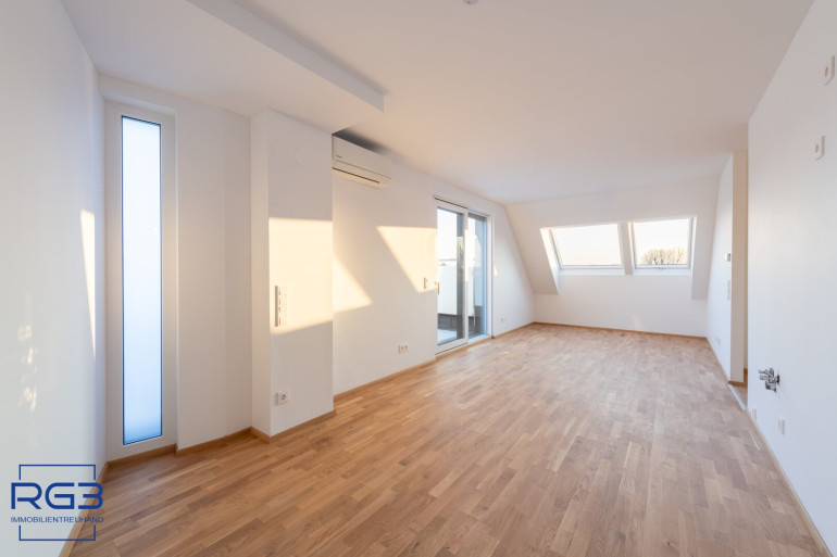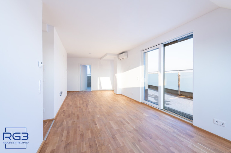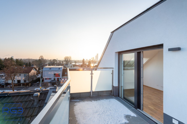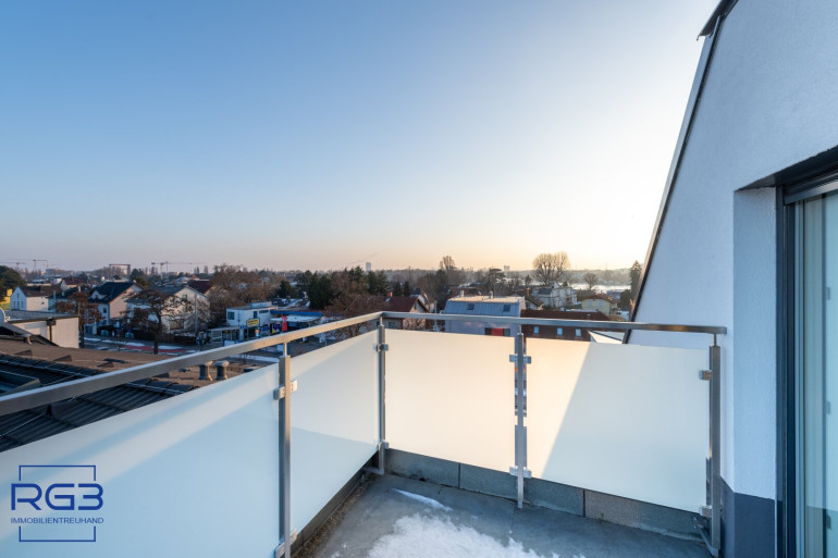 Geradeaus öffnet sich der Wohnbereich. Hier geht der Küchenraum fließend in das großzügige Wohnzimmer über. Der Raum ist angenehm geplant, hell und sehr gut möblierbar. Vom Schlafzimmer gelangen Sie direkt auf die Loggia mit einem wunderbaren Blick in den Südwesten Richtung Alte Donau, zu der Sie nur ca. 170m Gehweg haben.