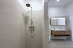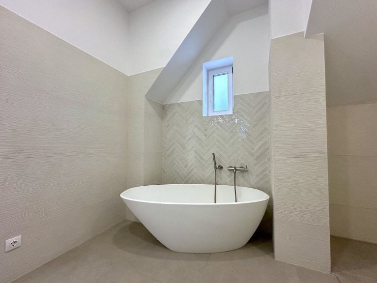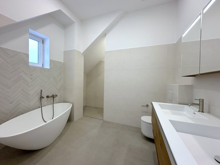 Eichenparkett, edles Feinsteinzeug sowie Fußbodenheizung sorgen für ein angenehmes Wohnklima, während das nachhaltige Energiekonzept mit Luftwärmepumpe und Photovoltaik modernen Komfort mit Effizienz verbindet.