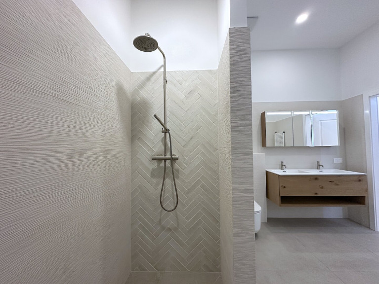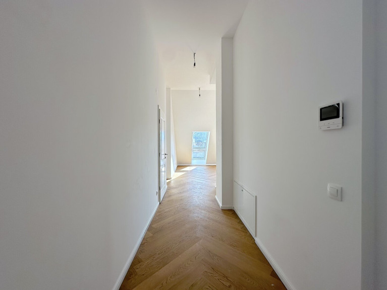 Der offen gestaltete Wohn- und Essbereich bildet das Herzstück der Wohnung – lichtdurchflutet und mit direktem Zugang zu den Terrassen. Das Schlafzimmer verfügt ebenfalls über eine eigene Außenfläche und bietet einen ruhigen Rückzugsort. Ein stilvolles Badezimmer mit Badewanne und Dusche, ein separates WC sowie ein praktischer Vorraum mit Stauraum runden das Raumangebot ab.