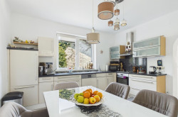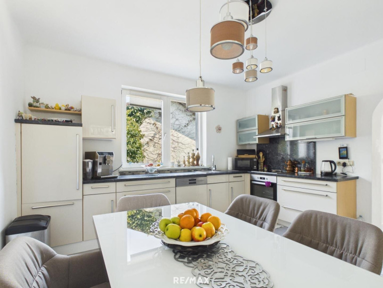 Die separate Küche ist modern eingerichtet und bietet genügend Raum für einen Essbereich. Große Fenster sorgen auch hier für eine helle und freundliche Atmosphäre.