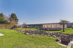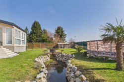 Der liebevoll angelegte Bachlauf, der sich durch den Garten zieht, verleiht dem Außenbereich eine außergewöhnliche Atmosphäre. Natursteine, Grünflächen und eine kleine Brücke schaffen ein harmonisches Gesamtbild und machen diesen Garten zu einer echten Wohlfühloase.