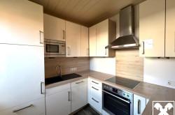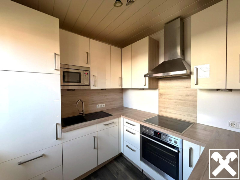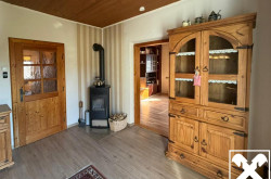 Die neuwertige Küche sowie ein gemütlicher Wohnbereich mit Ofen und Sichtfenster schaffen eine einladende Wohnatmosphäre.