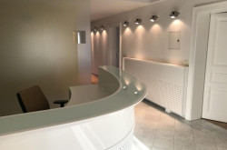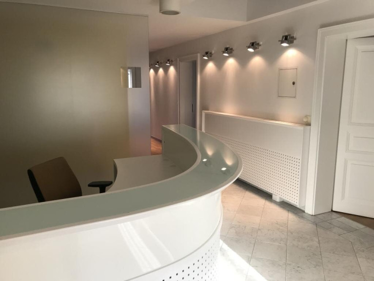 Das Büro ist mit hochwertigen Tischler-Maßanfertigungen wie Einbaukästen, Küche, Empfangs-bereich mit Pult sowie Beleuchtung ausgestattet.