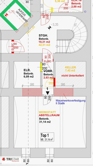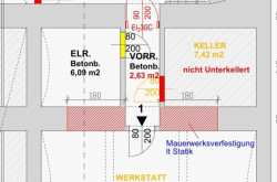 1 Werkstatt/ Lager im Kellergeschoss – 31,14 qm + Gang -WC 0,88 qm + Einlagerungsraum 3,10 qm (trocken, mit Strom ausgestattet)