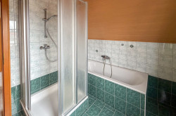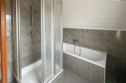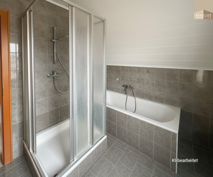 Ein Badezimmer mit Badewanne und Dusche sowie ein separates WC komplettieren diese Wohnebene und unterstreichen die durchdachte Planung des Hauses.