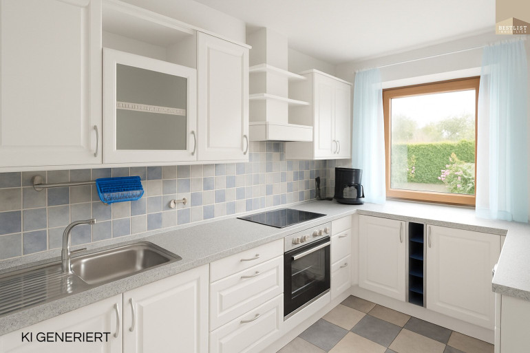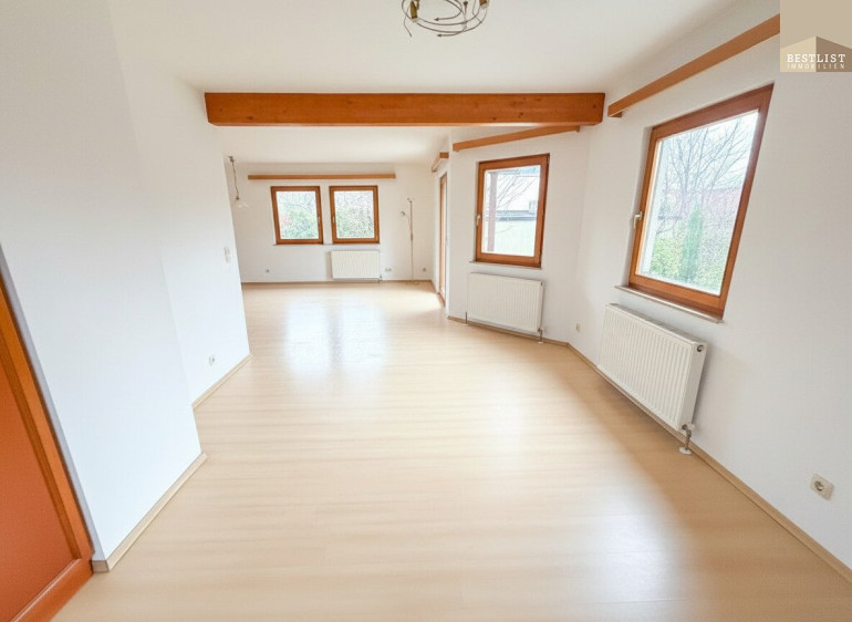 Das Herzstück des Hauses bildet der großzügige Wohnbereich. Großzügige Fensterflächen schaffen ein helles, freundliches Raumgefühl und öffnen den Blick ins Grüne. Von hier aus gelangen Sie sowohl in die separate Küche als auch auf die sonnige Terrasse mit angrenzendem Garten – ein klassisches Setting für Familienleben, gesellige Abende und entspannte Stunden im Freien.