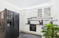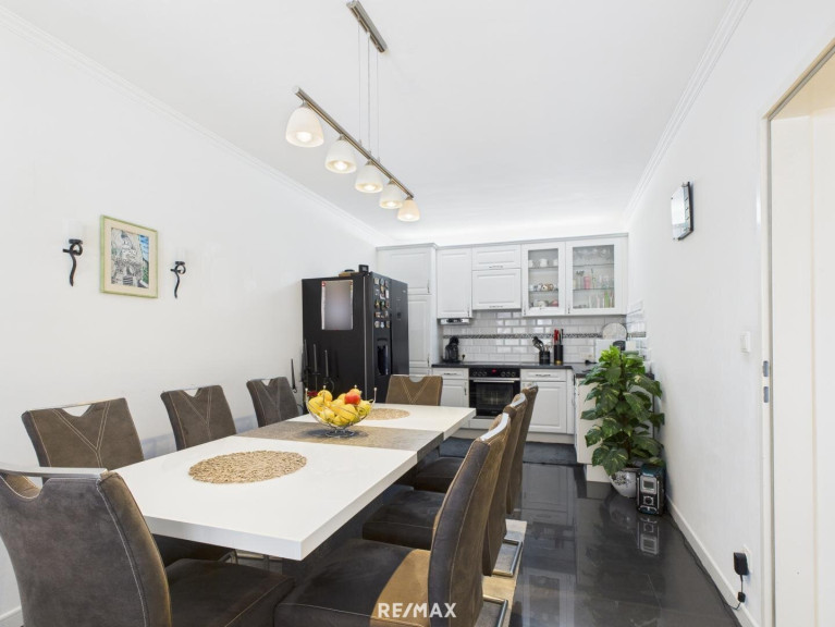 Die Küche und der Essbereich bilden gemeinsam einen abgeschlossenen Raum und sind vom Wohnbereich getrennt. Diese klare Trennung schafft Struktur im Alltag: Während im Essbereich gekocht und gemeinsam gegessen wird, bleibt das Wohnzimmer ein ruhiger Ort zum Entspannen.